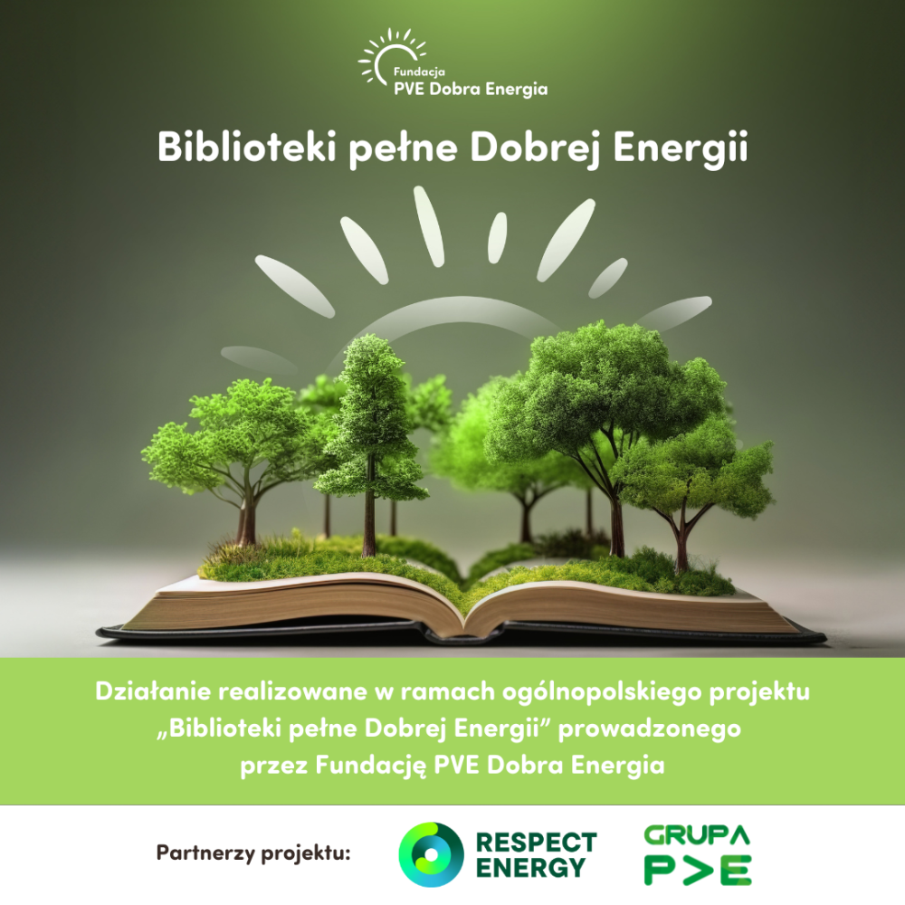 Biblioteka naszej szkoły została zakwalifikowana do udziału w ogólnopolskim projekcie Biblioteki pełne Dobrej Energii. Projekt ten jest organizowany przez Fundację PVE Dobra Energia i ma na celu wspieranie bibliotek szkolnych i publicznych z terenów wiejskich oraz rozwijanie wśród dzieci i młodzieży wiedzy na temat ochrony środowiska, odnawialnych źródeł energii, ekologii i zmian klimatycznych. Inicjatywa angażuje całą społeczność szkolną i zachęca do podejmowania działań na rzecz naszej planety.