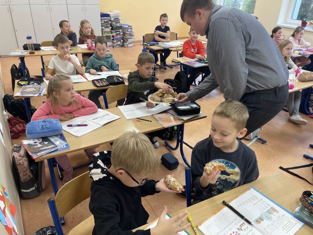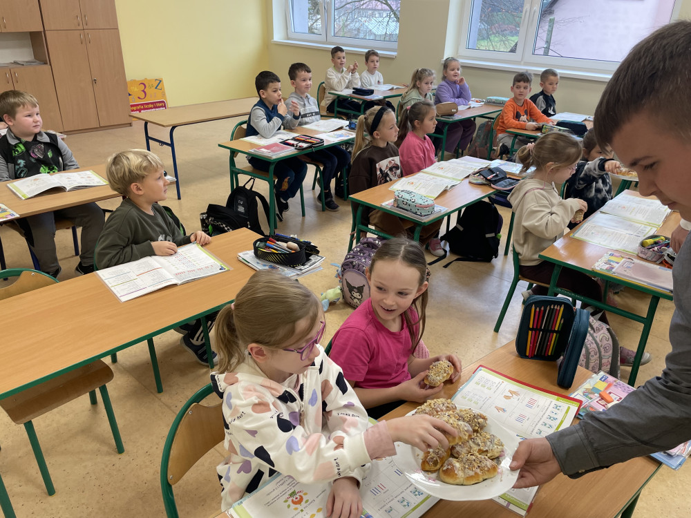 Zgodnie z coroczną tradycją - odwiedzali klasy w szkole by uroczyście podarować rogaliki marcińskie uczniom, nauczycielom i pracownikom szkoły. Dziękujemy Radzie Rodziców za przekazanie rogalików.